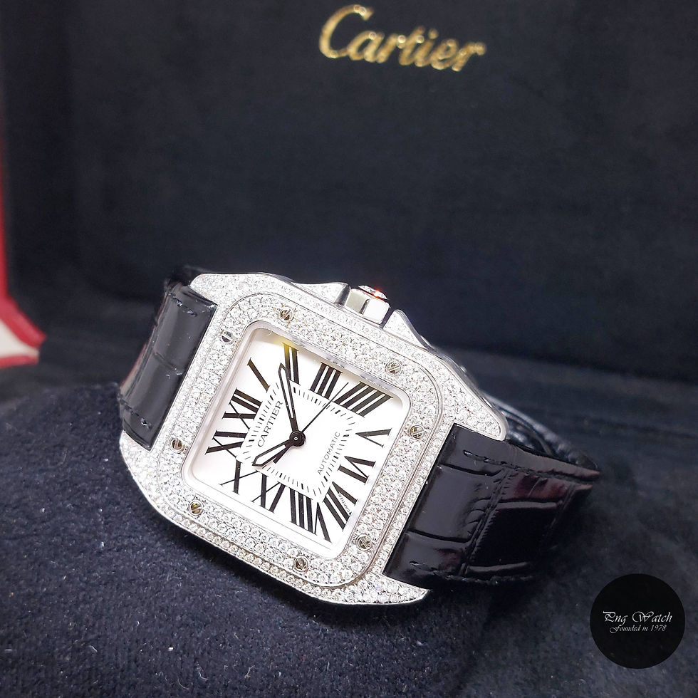 Cartier 35.6 x 44.2 Silver Opaline Diamonds Set Medium Santos 100 REF: W20106X8